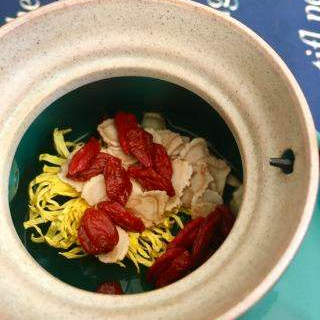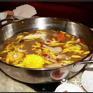 制法:菊花火鍋是蘇杭一帶的名饌藥膳,它將鮮菊花瓣浸入溫水中漂洗,撈起放入竹籃里濾凈,暖鍋里盛著原汁雞湯,將魚片或肉片投入鍋時,須抓一些菊花投入鍋中,魚片雞湯加上菊花“三合一”清香和鮮美。