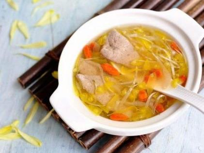制法:先將豬肝洗凈切片,放入熱油鍋內(nèi)略煸,加皇菊水(皇菊用紗布單包加水1000毫升,武火燒沸15分鐘,取出紗布袋,放入枸杞武火煮沸,15分鐘后改用文火,熟時放精鹽、味精調(diào)味)。